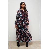 Elegant boho maxi dress with striking floral print throughout Flattering ruched waistband detail creates a defined silhouette Flowing long sleeves with gentle volume for a romantic touch Round neckline with delicate chain trim detail Full-length maxi design with graceful movement This enchanting Oasis maxi dress captures the essence of bohemian elegance with its dramatic floral print and flowing silhouette. The thoughtfully designed ruched waistband creates a flattering shape whilst the billowing long sleeves add a touch of romance to your ensemble. Perfect for formal occasions, this dress makes a captivating statement at weddings and garden parties alike. Style with strappy heeled sandals as shown for evening events, or dress down with metallic flat sandals for daytime sophistication. Add delicate gold jewellery to complement the neckline's chain detail, and finish with a sleek clutch bag. The versatile design transitions beautifully from spring celebrations to autumn gatherings, maki...