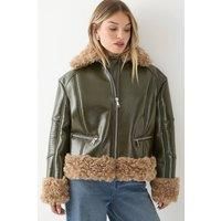 - Luxurious faux fur collar and cuffs create a striking contrast against the vinyl finish Statement oversized silhouette perfect for layering over your favourite outfits Practical front zip pockets for keeping essentials close at hand Full-length central zip fastening for easy wear Regular fit design offers comfortable movement for everyday wear Make a bold fashion statement with this eye-catching aviator jacket from MissPap