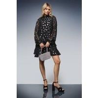 Elegant star jacquard pattern creates a dazzling visual effect throughout the dress High neck design offers sophisticated coverage with a contemporary edge Sheer long sleeves with voluminous shape add dramatic flair Playful ruffle hem detail creates movement and dimension Shift silhouette provides comfortable wear while maintaining a chic profile This captivating mini dress from Dorothy Perkins Luxe collection showcases a stunning star jacquard pattern that catches the light beautifully. The high neckline and sheer billowy sleeves strike the perfect balance between modest coverage and fashion-forward styling. The ruffle detail at the hem adds a playful touch to this sophisticated piece. Style with platform heels and a sparkly clutch as shown for evening soires, or dress it down with opaque tights and ankle boots for winter gatherings. This versatile dress transitions effortlessly from office Christmas parties to festive dinners with friends. The mini length makes it ideal for showing o...