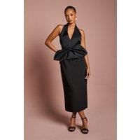 Striking halter neck design with plunging V-neckline for an elegant silhouette Dramatic oversized bow detail at the waist creates a statement focal point Sleek column midi cut with a sophisticated back vent for ease of movement Structured satin fabric offers a luxurious sheen and maintains the dress's architectural shape Petite-friendly proportions ensure the perfect fit for smaller frames Make a memorable entrance at your next special occasion in this architectural Coast midi dress. The halter neckline frames the dcolletage beautifully, while the column silhouette creates a refined, elongating effect that's particularly flattering on petite frames. The showstopping oversized bow detail adds dramatic flair to this otherwise minimalist design. Style with strappy heels as shown and statement earrings to complement the clean lines of the dress. Perfect for cocktail parties, evening receptions or formal dinners, this piece offers versatility beyond the event season. For cooler evenings, la... - Manufacturers part number: Coast_5045771993132