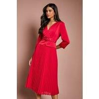 Satin Bodice Sleeve Pleat Skirt Belted Midi Wedding Guest Dress