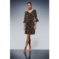 Elegant glitter jersey shift dress with eye-catching pattern throughout Flattering V-neckline frames the dcolletage beautifully Feminine ruffle detail adds movement and dimension Three-quarter length sleeves with flared cuffs for a graceful silhouette Comfortable stretch fabric ensures ease of movement whilst maintaining shape This sophisticated Wallis shift dress combines glamour and comfort for effortless evening style. The flattering V-neckline and ruffle detailing create a feminine silhouette that's both refined and contemporary. Perfect for cocktail parties, evening receptions or formal dinners, this versatile piece can be styled with strappy metallic heels and statement earrings as shown for maximum impact. For cooler evenings, layer with a tailored blazer or elegant wrap. The comfortable stretch jersey fabric ensures you'll feel as good as you look, whilst the glitter embellishment catches the light beautifully as you move. This dress transitions seamlessly from day to evening e...