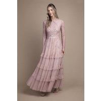 Intricate embellished artwork adorns the bodice Long sleeves with delicate sheer detailing Tiered maxi skirt for a dramatic silhouette Round neckline adds a touch of elegance Floor-length design perfect for formal occasions This stunning bridesmaids maxi dress from Coast is a vision of sophistication and grace. The embellished artwork on the bodice catches the light beautifully, creating a mesmerising effect as you move. The long sleeves feature sheer detailing, adding a touch of allure while maintaining a modest appearance. The tiered skirt cascades elegantly to the floor, creating a romantic and ethereal look that's perfect for walking down the aisle. Style with delicate drop earrings and a sleek updo to showcase the intricate neckline. For the ultimate bridal party ensemble, coordinate with your fellow bridesmaids in matching or complementary hues. This dress is designed to make you feel confident and radiant as you support the bride on her special day, ensuring you look picture-per...