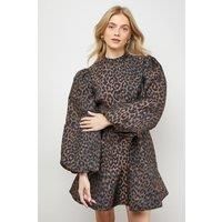 Striking leopard print jacquard fabric with textured finish for added dimension Statement balloon sleeves create a dramatic silhouette High neckline offers sophisticated coverage Mini length design perfect for showcasing legs Relaxed fit through the body with subtle flare at the hem Make a statement at your next casual gathering in this eye-catching leopard print mini dress from Oasis. The textured jacquard fabric adds a touch of luxury to this playful piece, while the dramatic balloon sleeves create a fashion-forward silhouette that commands attention. The high neckline balances the shorter length perfectly, making this dress both stylish and appropriate for family gatherings or brunches with friends. Style with gold-toned statement earrings as shown and pair with flat ankle boots or ballet pumps for an effortlessly chic daytime look. For cooler days, layer with a cropped denim jacket and opaque tights. This versatile piece transitions beautifully from weekend shopping trips to casual...