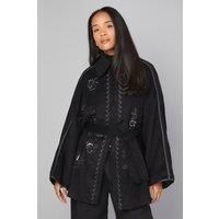 Dramatic cape silhouette with elegant wide sleeves for sophisticated movement Intricate floral embroidery detail adds a touch of artisanal craftsmanship Contrasting piping along the edges creates a refined outline Belted waist design allows for customisable fit and flattering shape definition Versatile open-front styling with a structured collar for a polished finish Make a statement entrance at any sophisticated gathering with this exquisitely embroidered cape coat from Wallis. The dramatic silhouette combines the elegance of a cape with the practicality of a coat, creating a piece that's both functional and fashion-forward. Style with tailored trousers as shown for a coordinated ensemble that works beautifully for evening events or formal occasions. The belted waist offers figure-defining structure while the embroidered detailing adds a touch of glamour without overwhelming. Perfect for layering over evening wear or smart separates, this versatile piece transitions effortlessly from ... - Manufacturers part number: Wallis_5045772299844