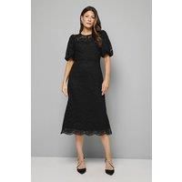Exquisite all-over lace design with scalloped hem detailing for a refined finish Elegant puff sleeves add a contemporary twist to this classic silhouette Flattering midi length falls gracefully below the knee Sophisticated crew neckline complements the feminine lace pattern Defined waistband creates a structured, figure-enhancing shape This stunning Wallis lace midi dress combines timeless sophistication with modern detailing. The intricate lace overlay creates a luxurious texture throughout, whilst the puff sleeves add a fashionable dimension to this elegant piece. Perfect for formal occasions, this dress presents a refined silhouette that flatters the figure with its defined waistband and flowing midi length. Style as shown with embellished pointed heels for weddings or race days, or dress down slightly with a tailored blazer and court shoes for evening dinners. The versatile design makes it an ideal choice for graduations, formal garden parties or evening receptions where you wish t... - Manufacturers part number: Wallis_5045772331544