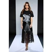 Crafted from genuine leather for authentic texture and durability Statement fringe detail creates dramatic movement with every step Mid-length design offers versatile styling options Sleek, form-fitting silhouette through the hips Part of the exclusive RUNWAY 1.8.1.8 collection Make a bold fashion statement with this RUNWAY 1.8.1.8 Real Leather Fringe Skirt. The striking design combines a smooth leather body with dramatic fringe detailing that sways with your movement, creating a captivating visual effect. Style with a graphic tee as shown for an edgy daytime look, or pair with a fitted bodysuit for casual gatherings. The mid-length cut works beautifully with trainers for a contemporary urban aesthetic or with strappy sandals for evening drinks. This versatile piece transitions effortlessly from family brunches to art exhibitions, adding a touch of rock-chic to your wardrobe. The genuine leather construction ensures this standout piece will develop a unique patina over time, becoming e... - Manufacturers part number: Debenhams_5045772342373