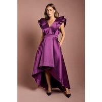 Exquisite frill sleeves add a touch of drama to this elegant midi dress Flattering V-neckline elongates the silhouette Crafted from twill fabric for a luxurious look and feel Dipped hem creates a striking asymmetric finish Concealed back zip fastening for a seamless fit Radiate sophistication at your next formal event in this stunning midi dress from Coast. The frill sleeves and V-neckline exude a refined femininity, while the dipped hem adds a contemporary twist. Style with sleek heels and a clutch for a polished ensemble that will turn heads at weddings, races, or any other special occasion. | Coast Women's Frill Sleeve V Neck Midi Dress in Purple | Size: 10