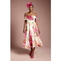 Elegant Bardot neckline with graceful off-shoulder design Luxurious organza fabric with striking stripe pleated bodice Flattering midi length with voluminous A-line silhouette Delicate floral pattern throughout for a romantic aesthetic Fully lined for comfort and structure Make a captivating entrance at your next special occasion in this stunning Coast midi dress. The exquisite organza fabric creates a wonderfully light and airy feel, whilst the pleated bodice adds textural interest and structure. The Bardot neckline gracefully frames the dcolletage, offering a timeless and feminine appeal perfect for weddings and formal gatherings. Style as shown with coordinating heeled sandals and a statement fascinator for race day sophistication, or pair with elegant court shoes and delicate jewellery for a wedding guest ensemble that commands attention. The midi length offers versatility for various formal settings, whilst the flowing A-line silhouette ensures comfortable movement throughout your...