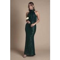 Sculpted to a curve-hugging maxi silhouette with a halter neck and a draped bodice, this dress is swathed in dazzling sequins for a truly showstopping bridesmaid style. Made from sequins: dazzling from every angle, this sequin fabric has been opulently embellished for a full-on shimmer effect. Woven onto a fluid, mesh fabric that gracefully drapes over your figure. Level of stretch: medium. This dress fastens with a rear concealed zip. Model is 5ft 10in/1.77m and wears a size UK10. | Coast Women's Halterneck Sequin Bridesmaid Maxi Dress in Emerald | Size: 12
