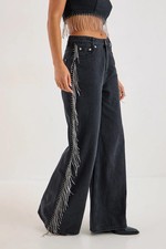 Striking diamante tassel detailing along the outer leg seam for a show-stopping effect Classic straight leg silhouette with a flattering high-rise waist Traditional five-pocket design with metal hardware accents Relaxed fit through the thigh with a full-length leg Versatile denim fabric with a structured yet comfortable feel Make a statement on your next night out with these eye-catching Diamonte Tassel Straight Leg Jeans from NastyGal. The dramatic metallic chain tassels cascade down the outer leg, cre...
