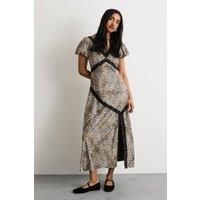 Striking polkadot pattern with elegant lace trim detailing Feminine puff sleeves add volume and contemporary charm Flattering V-neckline with contrasting lace panels Midi length with sophisticated side split for ease of movement Flowing silhouette creates a graceful, feminine profile This captivating midi dress from Warehouse combines playful pattern with sophisticated design elements. The distinctive puff sleeves create a modern silhouette whilst the contrasting lace trim adds a touch of delicate texture. The side split offers both practical movement and a subtle flash of leg, making this piece versatile for various occasions. Style with flat Mary Janes as shown for a casual daytime look perfect for family gatherings or weekend brunches. For a more dressed-up approach, pair with block-heeled sandals and gold hoop earrings. The V-neckline frames the dcolletage beautifully, whilst the flowing midi length creates a balanced proportion that works wonderfully on different body types. This ... - Manufacturers part number: Warehouse_5045772826064