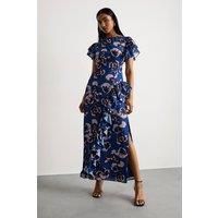 Striking floral print maxi dress with elegant side split detail Feminine ruffle detailing cascades down the side for added movement Flattering crew neckline with delicate short flutter sleeves Floor-length maxi silhouette creates a sophisticated profile Fully lined for comfort and a smooth drape against the body Make a statement at your next special occasion with this captivating Side Split Ruffle Detail Maxi Dress from Warehouse. The eye-catching floral pattern creates visual interest while the side split adds a contemporary touch that allows for effortless movement. Style with strappy heeled sandals as shown for formal events such as weddings or race days. For evening soires, complement with a sleek clutch bag and delicate drop earrings to enhance the dress's feminine aesthetic. The ruffle detailing creates a beautiful sense of dimension that catches the light as you move. This versatile piece transitions beautifully from daytime garden parties to evening receptions with a simple cha... - Manufacturers part number: Warehouse_5045772826729