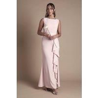 Elegant sleeveless maxi dress with a sophisticated round neckline Flattering sash waist detail that accentuates the silhouette Dramatic cascading ruffle detail along the side for added movement Smooth satin fabric that drapes beautifully to the floor Floor-length design with a subtle flare for graceful movement This exquisite Coast bridesmaid dress combines timeless elegance with contemporary design elements. The sleek silhouette features a round neckline and sleeveless cut that creates a refined canvas, whilst the sash waist cinches in perfectly to create a feminine shape. The standout cascading ruffle detail adds a touch of romance and movement as you walk down the aisle. Style with delicate metallic strappy sandals as shown and minimal jewellery to maintain the dress's sophisticated appeal. A sleek updo or soft waves will complement the clean lines of this gown beautifully. Perfect for the bridal party seeking a coordinated yet distinctive look, this maxi dress ensures each bridesma...