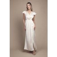 Elegant wrap front design creates a flattering V-neckline that frames the dcolletage beautifully Delicate flutter sleeves add a romantic touch whilst providing subtle arm coverage Carefully placed pleating at the waist creates a figure-enhancing silhouette Floor-sweeping maxi length offers timeless bridal party sophistication Side split detail allows for graceful movement as you walk down the aisle This exquisite Coast bridesmaid dress embodies refined elegance with its graceful wrap front and feminine flutter sleeves. The thoughtfully designed waist pleating creates a flattering silhouette that complements various body types within your bridal party. The flowing maxi length with subtle side split ensures comfortable movement throughout the wedding celebrations, from ceremony to dance floor. Style with delicate strappy heels as shown and minimal jewellery to maintain the dress's sophisticated aesthetic. For a coordinated bridal party look, this versatile design works beautifully in mat...