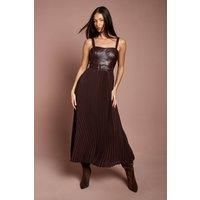 Striking square neckline with elegant wide straps for sophisticated support Structured PU bodice with subtle detailing for a contemporary edge Beautifully pleated midi skirt creating graceful movement with every step Matching belt with statement buckle to define and flatter the waistline Midi length design perfect for showcasing statement footwear This captivating strappy dress combines the edgy appeal of a structured PU bodice with the feminine grace of a pleated skirt, creating a stunning contrast that commands attention. The square neckline frames the dcolletage beautifully, while the wide straps provide comfortable support for all-day wear. The included belt cinches the waist for a figure-defining silhouette that flatters every curve. Style as seen with mid-calf boots for a modern twist on occasion dressing, or pair with strappy heels and a clutch for traditional wedding guest attire. This versatile piece transitions effortlessly from daytime race events to evening celebrations, ma...