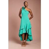 Striking one-shoulder design with an elegant corsage ruffle detail Crafted from smooth crepe fabric that drapes beautifully Dramatic high-low hemline with cascading tiered ruffles Fitted bodice that creates a flattering silhouette Midi length perfect for formal occasions and special events Make an entrance at your next special occasion in this show-stopping midi dress from Coast