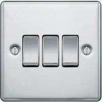 This polished chrome 10A triple light switch operates 3 different lights and the 2 way switching means a second switch can be added to the circuit to operate the same light from another location (e.g. at the top and bottom of the stairs). The decorative metal faceplate has a moisture control gasket and rounded edges.