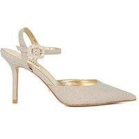 Dune London Channel Buckle Detail Heeled Courts - Gold Add a touch of glamour to your occasion ensembles with our Channel courts. Set on a stiletto heel the two-part ankle strap boasts a standout diamante buckle offering dimension and support. Finished with a lined footbed for added comfort Channel will become the focal point of your look. Material Content: PLAIN SYNTHETIC Washing Instructions: Wipe Clean