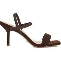 Designed to a modern, graphic silhouette, this mininal sandal is crafted from a subtle shimmering metallic fabric. Featuring a mid height stilletto heel this effortlessly stylish sandal features a square toe and two elegant elasticated straps that hold the ankle in place. | Dune London Women's 'Methodical' Suede Sandals in Brown | Size: 3