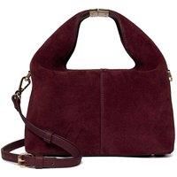 An elevated grab bag defined by its unique curved handle that doubles as the closure. Crafted in rich burgundy suede, it's finished with a gold branded clasp and a detachable crossbody strap for versatile styling. Elegant yet modern, it's a standout piece for every occasion. | Dune London Women's 'Debuts' Suede Bag in Burgundy - Manufacturers part number: Dune London_5050808737023