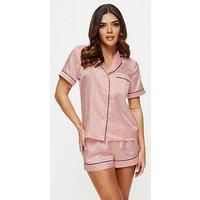 Ann Summers Signature Satin PJ Set Slip into the Ann Summers Signature Satin PJ Set and go to bed in style. Made from animal jacquard satin material with contrasting piping detail, this two-piece set features a short-sleeved shirt with a pocket on the chest and a button up front whilst the shorts have an elasticated waistband for a comfortable fit. Wear yours as a set for the most luxurious beauty sleep you can get. Made from jacquard satin Material Content: Polyester 100 % Two-piece set including a sho... - Manufacturers part numbers: 2007294|11YRR