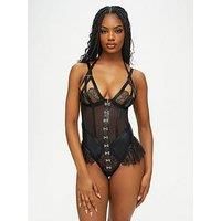 Explore all your fantasies in our Exuberant Crotchless Teddy. Combining lace, PU and mesh for a feminine yet edgy look, it features nipple skimming coverage on the cups and alluring over-bust strapping. With hook and eye fastenings down the centre front that lead to the fold-over crotchless opening and flattering style lines at the waistline. Finished with a lace frill at the hips, a swan hook fastening at the neck and centre back, and a mesh Brazilian. Wear yours with a pair of hold ups for an effortle... - Manufacturers part number: Ann Summers_5050890715718