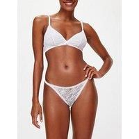 KBX Alice String Made from a modern framed lace, the white Alice string by KBX offers a comfortable and pretty addition to your lingerie drawer. With an elasticated waistband, a string-shaped back that offers a barely there feel and brushed gold hardware to complete. Made from modern lace with framed edges Material Content: Poly amide 85 %, Elastane 15 % Brushed gold hardware at centre front Low rise Elasticated waistband String - Manufacturers part number: 129WX