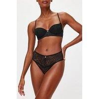KBX Alice Deep Thong Made from a modern framed lace, the black Alice deep thong by KBXoffers a comfortable and pretty addition to your lingerie drawer. Complete with a wide-cut, elasticated waistband that hugs your hips, a narrow thong back and detailed with subtle brushed gold hardware at the centre front. Made from modern lace with framed edges Material Content: Poly amide 85 %, Elastane 15 % Brushed gold hardware at centre front Wide, elasticated waistband Thong Lace 85% Polyamide, 15% Elastane. Guss...