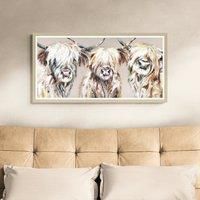 * Ready to hang* Champagne coloured frame* Animals* Textured finish This print by Nicola Jane Rowles features three cows in natural colours with a textured finish in a champagne-coloured frame. Its ready to hang from D ring hanging points and would make a lovely feature. - Manufacturers part number: 30958842