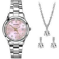 Sekonda Womens Catherine Silver Stainless Steel Bracelet with Pink Mother of Pearl Dial Analogue Watch Gift Set This beautiful Catherine gift set is made up of a silver watch, silver earings and matching necklace. The watch has a silver stainless steel bracelet and a stone set, pink mother of pearl dial. Completing the set with the matching silver pendant necklace and earrings - a classic pairing that brings effortless luxury to any outfit. Wear the full set together for a refined & coordinated look, or...