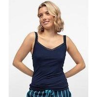 Cyberjammies Marina Navy Jersey Hidden Support Vest Size & Fit True to size - order your usual size Available in sizes 6 - 28 Details Marina Navy Jersey Hidden Support Vest - Navy by Cyberjammies Blue Sleeveless Adjustable straps Scoop neck Pull on Lace trims Hidden support Material & Care Material Content: 95% Modal + 5% Elastane Washing Instructions: Machine Washable