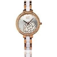Elegant Embossed Flower Dial: Distinctive floral design adds sophistication. Precision Quartz Movement: Citizen Miyota mechanism for reliable timekeeping. Gift-Ready Presentation: Arrives in a luxurious gift box. Manufacturer9s Warranty: Covers defects in materials and workmanship. Gold Metal Link Bracelet: Stylish and versatile for any occasion. Splash-Proof: Handles everyday splashes for practical wear.