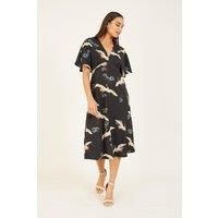 Expertly crafted from lightweight fabric, this midi dress from Yumi falls below the knee. In a relaxed shape, it's framed by flared sleeves, a flattering empire line, and a classic V-neckline. The cool crane print lends a stylish finish. | Yumi Women's Black Crane Print Midi Dress | Size: 8 - Manufacturers part number: Yumi_5052011994736