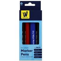 Make your mark with this fantastic set of four Dry Wipe Marker Pens! These remarkable pens come in colours black, blue and red. Includes: 1 x Red 1 x Blue 2 x Black Perfect for use at work, school or home. These pens are suitable to write, draw and doodle on any whiteboard surface. Product Information: Dry Wipe Marker Pens Pack of 4 Colours: Red, Blue & Black Works Essentials 3mm nib