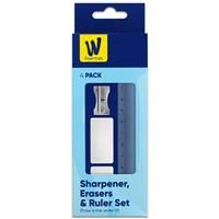 Stock up on stationery essentials with this Sharpener, Erasers and Ruler Set from Works Essentials. Includes: 1 x 15cm Ruler 2 x Erasers 1 x Sharpener The stationery set includes four items to fill up your pencil case ready for the new school year. Perfect for use at home, work or school. Product Information: Sharpener, Erasers & Ruler Set Stationery set Draw a line under it Brand: Works Essentials