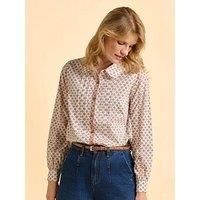 Brakeburn Tarja Blouse - Beige A fresh take on a classic, the Tarja Blouse is crafted from crisp cotton poplin with a playful orange and blue print. Featuring a Peter Pan collar, delicate front pleats, burnt orange embroidery and wooden buttons, it's full of thoughtful detail. Style with barrel jeans and comfy trainers. Material Content: 100% Cotton Washing Instructions: Machine Washable