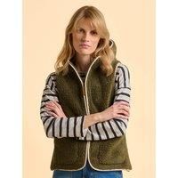 Embrace the cold in our Snug Gilet. Crafted from olive green teddy fabric with cream piping for subtle contrast, it features a fitted hood, soft edges, and handy open pockets. Its the perfect layer when paired with a long sleeve tee, barrel jeans and walking boots.