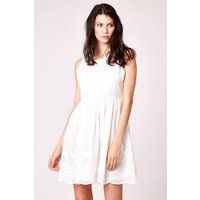 Perfect for sunny days, this fresh white knee-length dress offers effortless style. It features a simple sleeveless bodice and a full skirt with intricate embroidered cutwork along the hem, ideal for casual outings or a relaxed daytime event. The skirt is adorned with beautiful eyelet detailing, adding a delicate and elegant touch. | Cutie London Women's Fresh White Embroidered Fully Lined Skirt Dress | Size: 10 - Manufacturers part number: Cutie London_5052562008494
