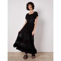 Update your dress collection with this must-have maxi. Crafted from a dobby fabric and lined for comfort, it features a tiered skirt, lace inserts, and a corset waist to create an ultra-flattering fit. | Apricot Women's Lace Detail Corset Maxi Dress in Black | Size: 16