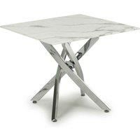 This eye catching square end table adds a touch of glamour to any room. The heat and stain resistant tempered glass top comes in a white and grey marble effect print finish. The silver chrome support frame features 4 wrapped around legs to create a stunning base, with adjustable legs. Assembly required. Sold individually. Features: Heat and stain resistant tempered glass top White and grey marble effect print finish Silver chrome support frame Comfortably seats 4 people Assembly required Sold individual...