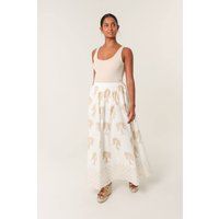 The perfect maxi skirt this season offering a fresh and fun look with it sits high on the waist and flares to a tiered shape. | Blue Vanilla Women's Ivory Gold Palm Print Circle Skirt | Size: Medium/Large - Manufacturers part number: Blue Vanilla_5052868702829