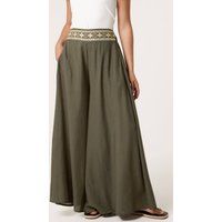 Combining the lightness of a loose fit with the nostalgic appeal of summer style, these trousers are the perfect piece to express your individuality this summer distinctive vintage pattern adds a touch of old world charm. | Blue Vanilla Women's Khaki Wide Leg Embellished Linen Trousers | Size: XL - Manufacturers part number: Blue Vanilla_5052868756655