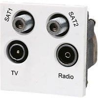 TV, FM and satellite quadruplexer unit for connection to a single co-axial aerial lead with two satellite, TV and FM signals combined. TV, FM Radio & Satellite Sockets Requires 35mm Back Box Screw Terminals Female, Male & 2 x F-Type Sockets For AV Installations - Manufacturers part number: 31768