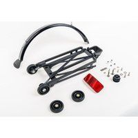 The Brompton Complete Rear Rack uses a genius design that offers extra carrying capacity, makes the bike more stable when folded and finally allows the bike to be easily rolled along when folded. The kit includes a rear rack complete with 4 roller wheels, shock cord, rear mudguard and flap, reflector, seat post bung, all necessary fixings and full detailed fitting instructions.This black rear rack is suitable for Black Edition Brompton’s. - Manufacturers part number: Brompton_Q100669