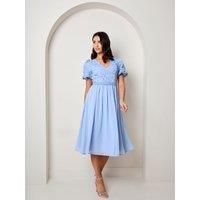 Puff Sleeve Premium Lace Midi Dress in Blue
