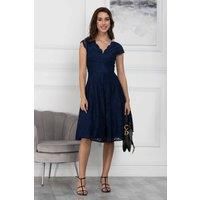 Opt for the texture of lace at your next seasonal occasion, with this ultra-feminine dress from Jolie Moi. Crafted from an intricate floral lace that's fully lined for comfort, it features delicate cap sleeves, a scalloped v-neckline and falls just below the knee for a 1950's inspired silhouette. The tulle lining creates a voluminous finish as a evening wear dress, A plunging v-back and exposed zip fastening to show the detailing of the back. | Jolie Moi Women's Cap Sleeve 50s Lace Dress in Navy | Size: 8 - Manufacturers part number: Jolie Moi_5053319215677