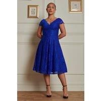 Opt for the texture of lace at your next seasonal occasion, with this ultra-feminine dress from Jolie Moi. Crafted from an intricate floral lace that's fully lined for comfort, it features delicate cap sleeves, a scalloped v-neckline and falls just below the knee for a 1950's inspired silhouette. The tulle lining creates a voluminous finish as a evening wear dress, A plunging v-back and exposed zip fastening to show the detailing of the back. | Jolie Moi Women's Cap Sleeve 50s Lace Dress in Bright Blue | Size: 10 - Manufacturers part number: Jolie Moi_5053319227656