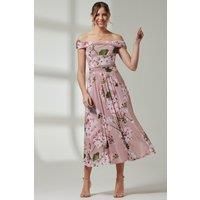 Perfect for weddings or special events, it's made from a delicate mesh fabric with an overall floral print and nipped-in at the waist before flaring out through the skirt, this dress sits off the shoulders with an alluring twist Bardot neckline. Fully lined for comfort and finished with a pull on fastening. Wear with metallic strappy heels to dazzle at your next occasion invite. | Jolie Moi Women's Paula Bardot Neck Mesh Dress in Dusty Pink | Size: 14 - Manufacturers part number: Jolie Moi_5053319357001
