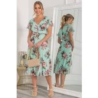 In a flattering fit-and-flare silhouette, this midi dress by Jolie Moi is doused in pretty florals and cut from a premium mesh fabric with full lining. Accentuating the figure with a V neckline and short angel sleeves, it is a laidback faithful that be teamed with a bright shawl to wear to anything from weddings to garden parties. | Jolie Moi Women's Bethany Mesh Midi Dress in Green | Size: 10 - Manufacturers part number: Jolie Moi_5053319378181